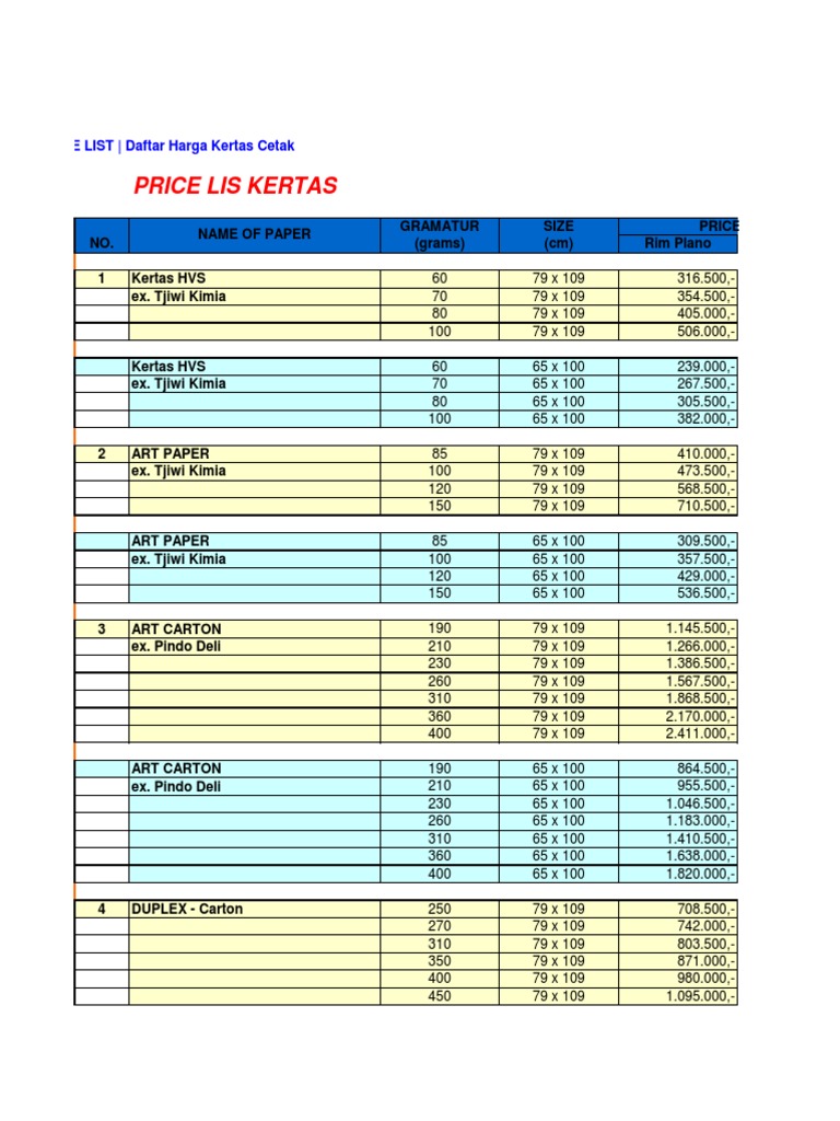 Berikut adalah daftar harga kertas berukuran plano terbaru untuk tahun 2018. 1232020 Macam Kertas Duplex. Daftar Harga Pemotong Kertas.