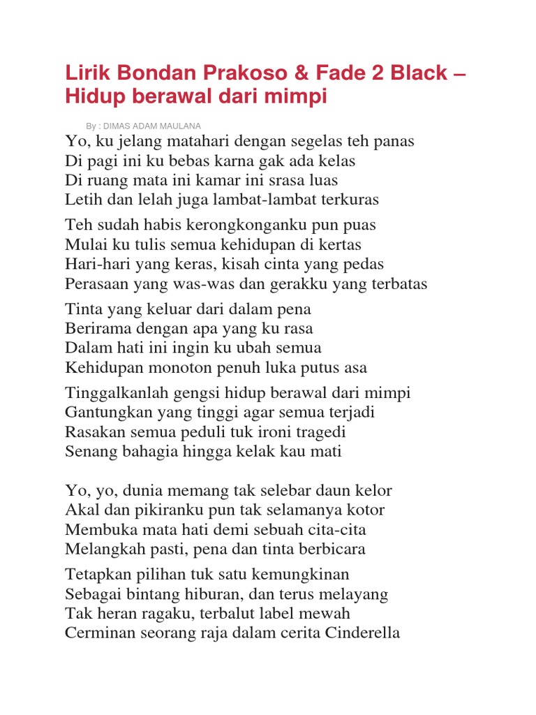 Thedarlingbakers Lirik Lagu Bondan Prakoso Fade2black Hidup Berawal Dari Mimpi