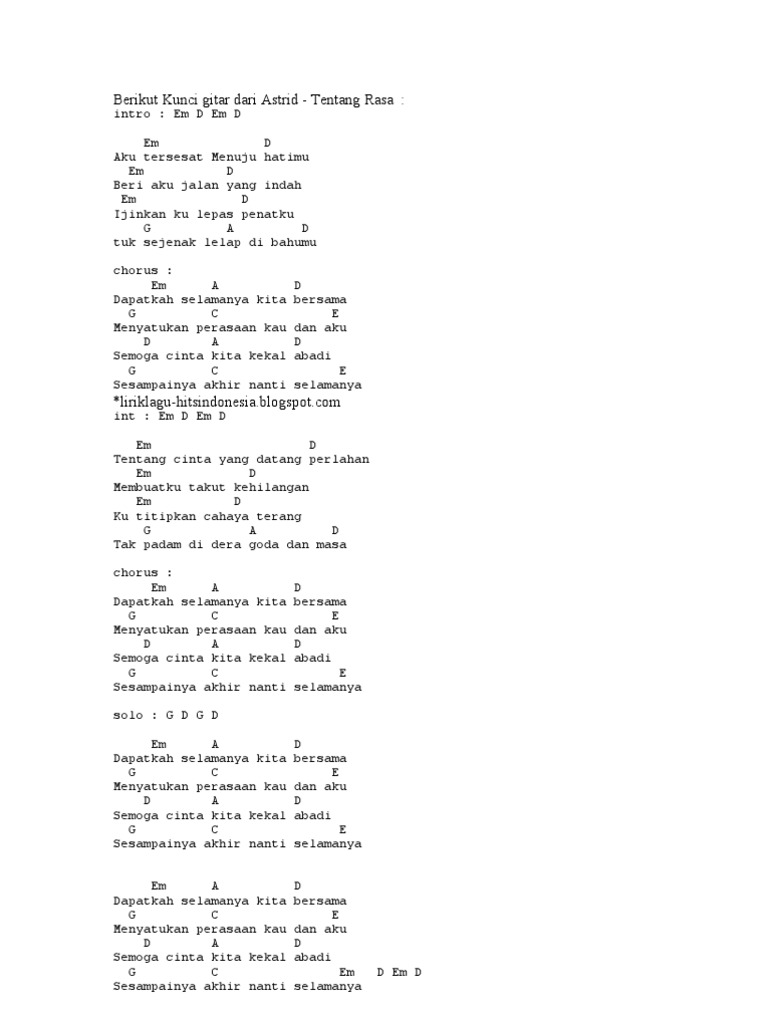D -A Bm Selamanya kita akan bersama G Fm Melewati segalanya Em A Bm Yang dapat pisahkan kita berdua -A G Selamanya kita akan bersama Fm Em Fm Takkan ada keraguan G A Kini dan nanti D Percayalah Musik. Dm biarlah-biarlah C hariku dan harimu. Dalam lirik lagu Tentang Rasa Astrid mengungkapkan rasa cinta yang begitu dalam.